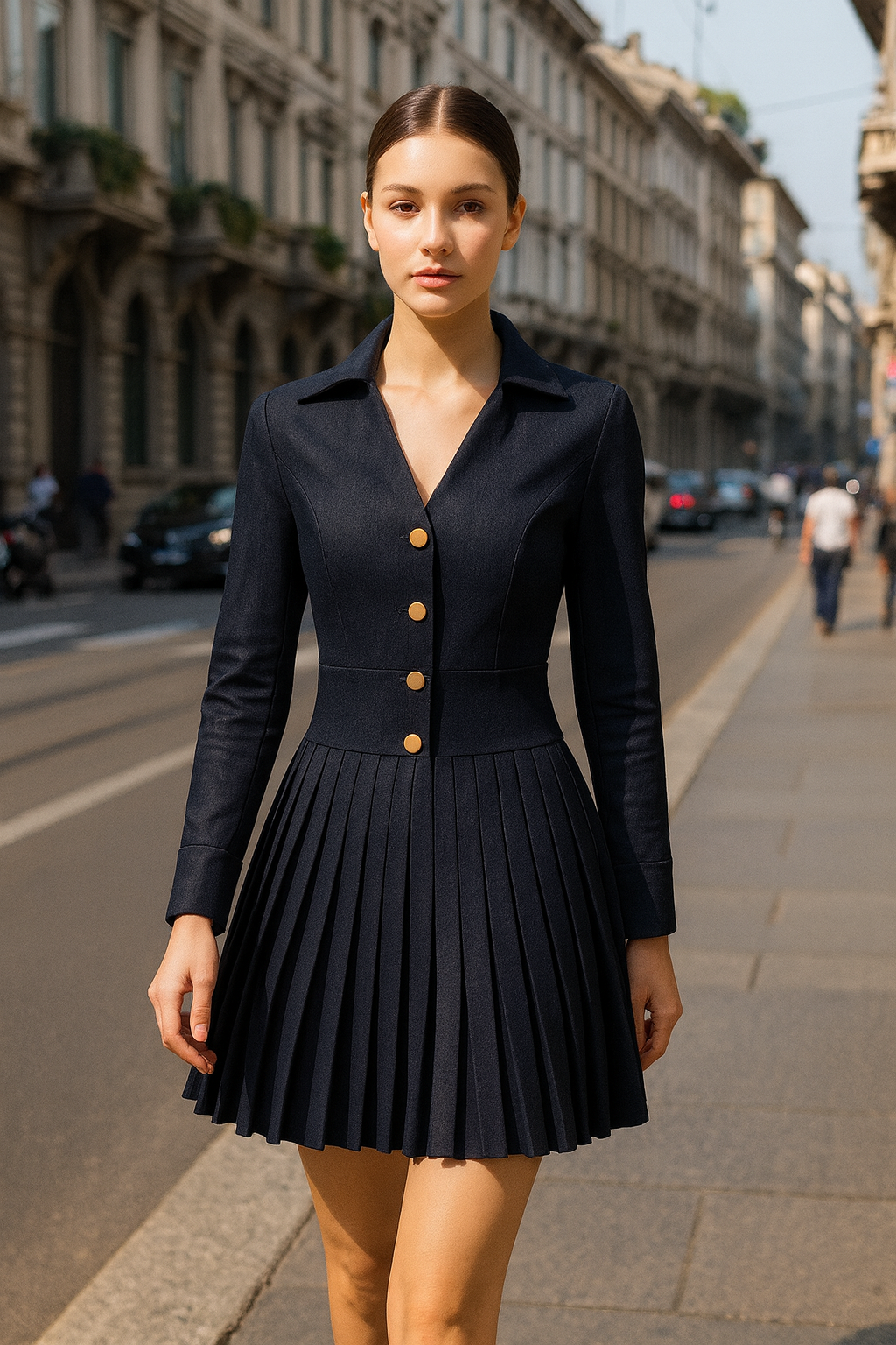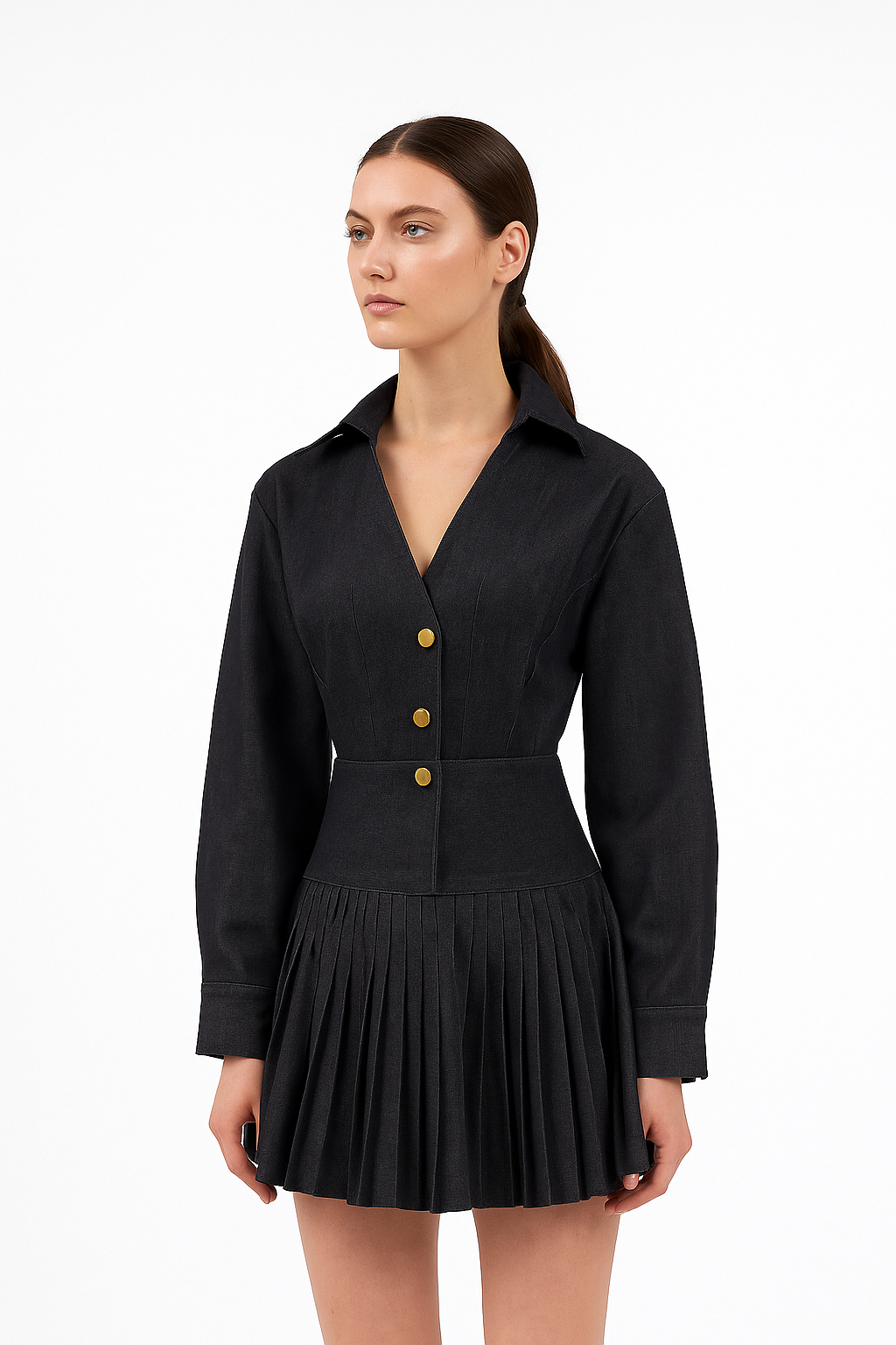 The Midnight Noir Pleated Mini Denim Co-Ord Dress blends timeless tailoring with playful movement. Crafted in a deep black hue, this piece features a structured shirt-style bodice with a sharp collar, deep V-neckline, and gold statement buttons for a touch of elegance. The fitted waist flows into a finely pleated mini skirt, creating a flattering A-line silhouette that moves beautifully with every step. Perfect for both day-to-night dressing, this versatile design pairs effortlessly with boots, heels, or statement accessories.